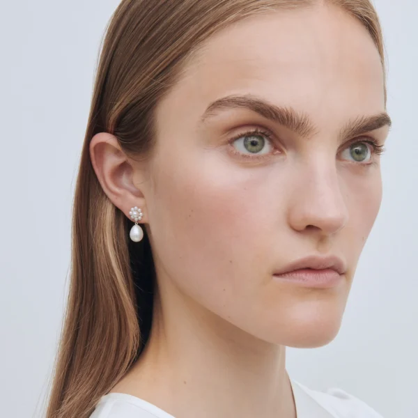 Yellow gold chain small hoop earrings with pear shape and round white diamonds