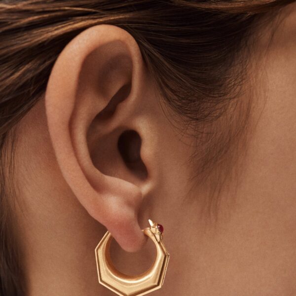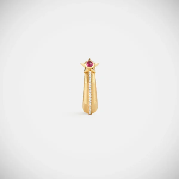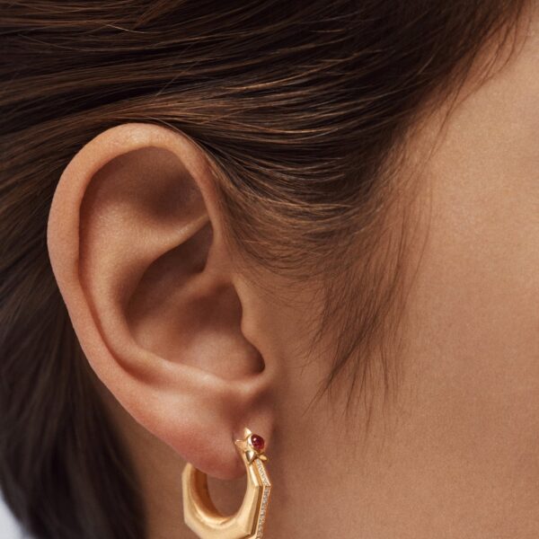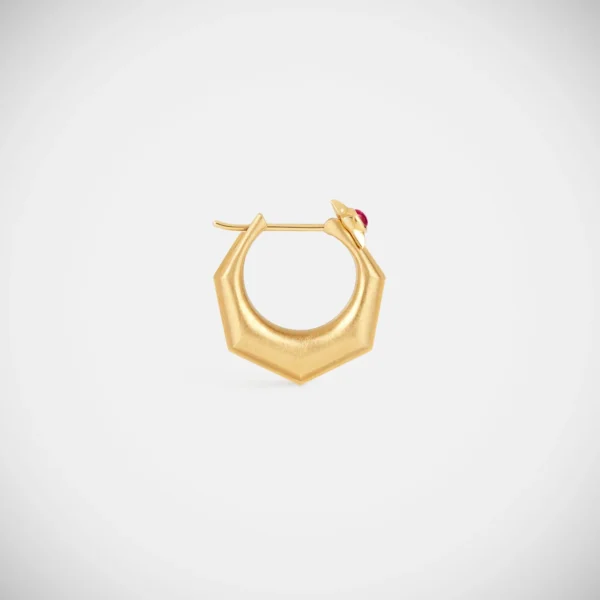 Yellow gold hoop earring, set with white diamonds and a ruby.