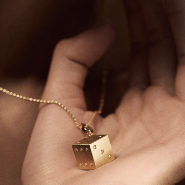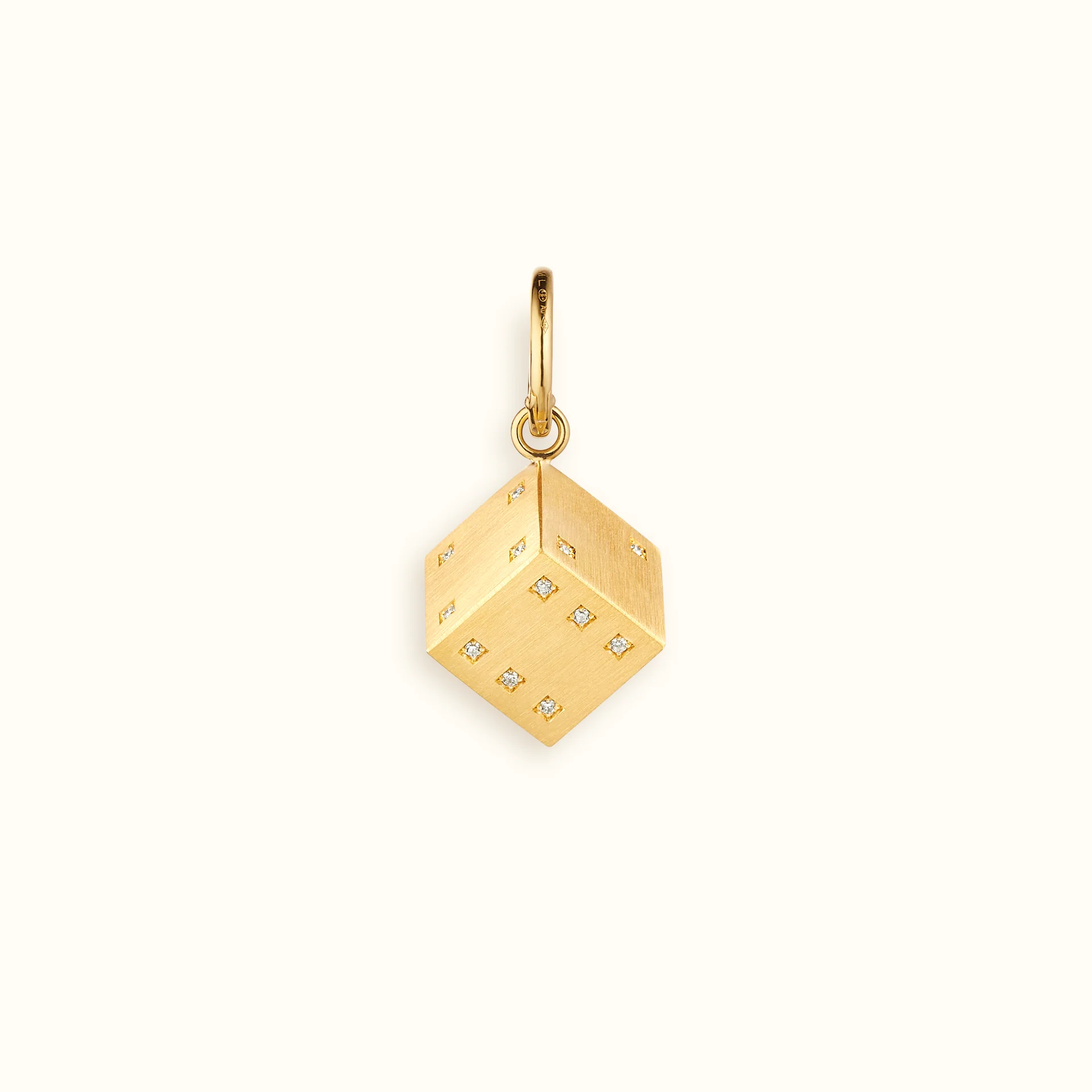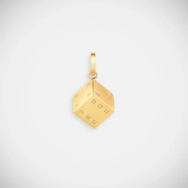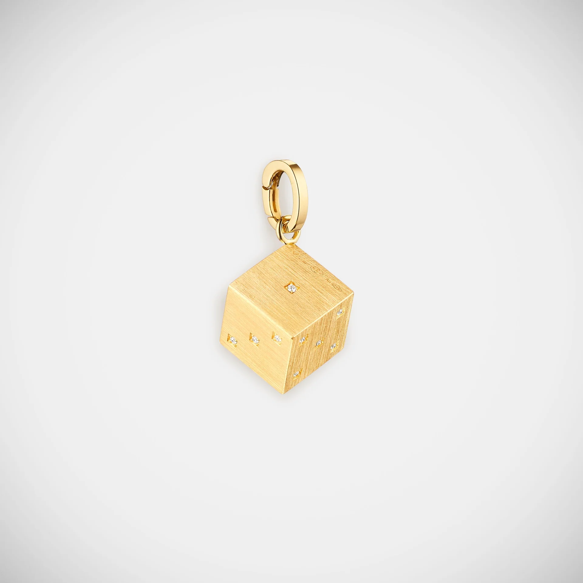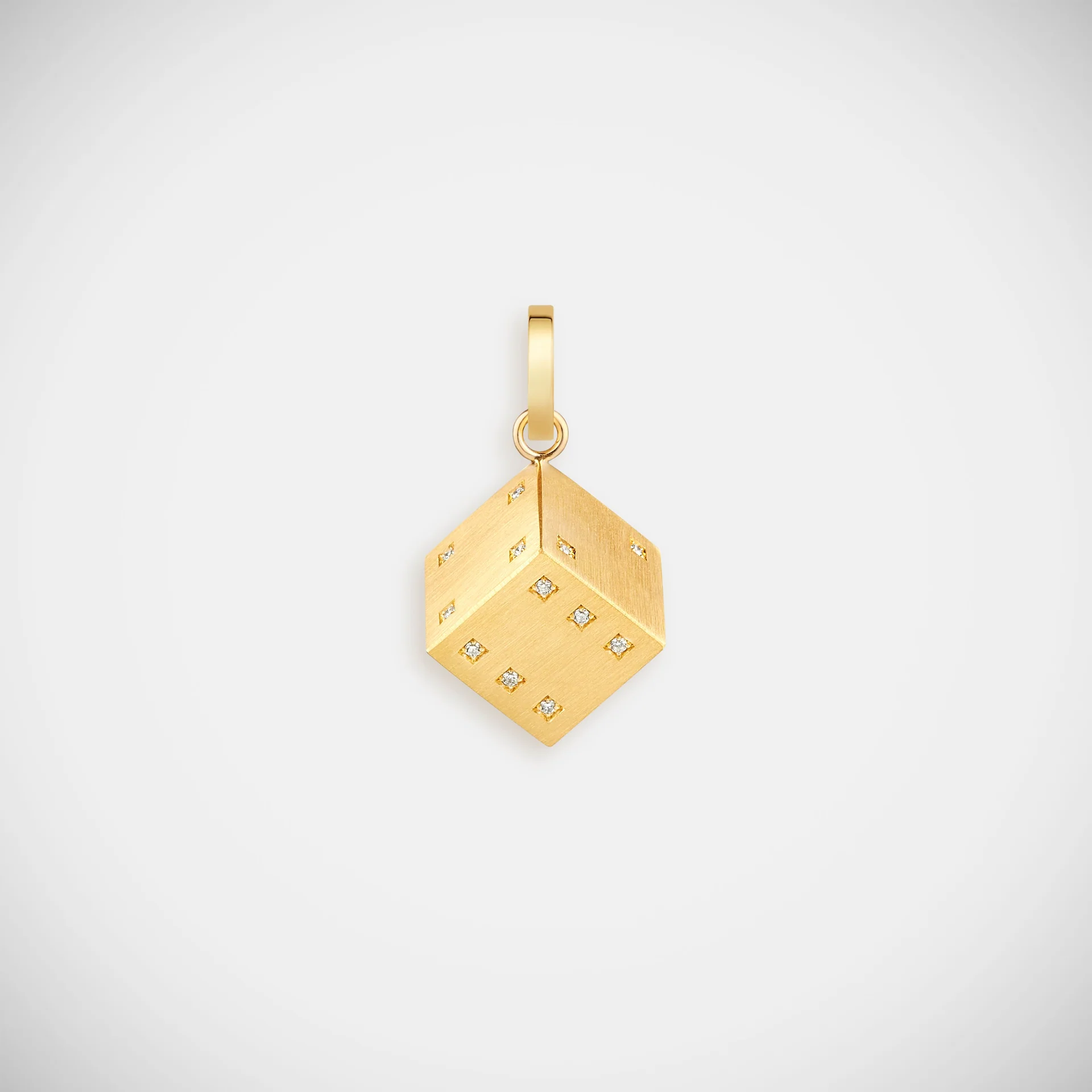 Yellow gold dice pendant with a brushed finish, set with white diamonds.