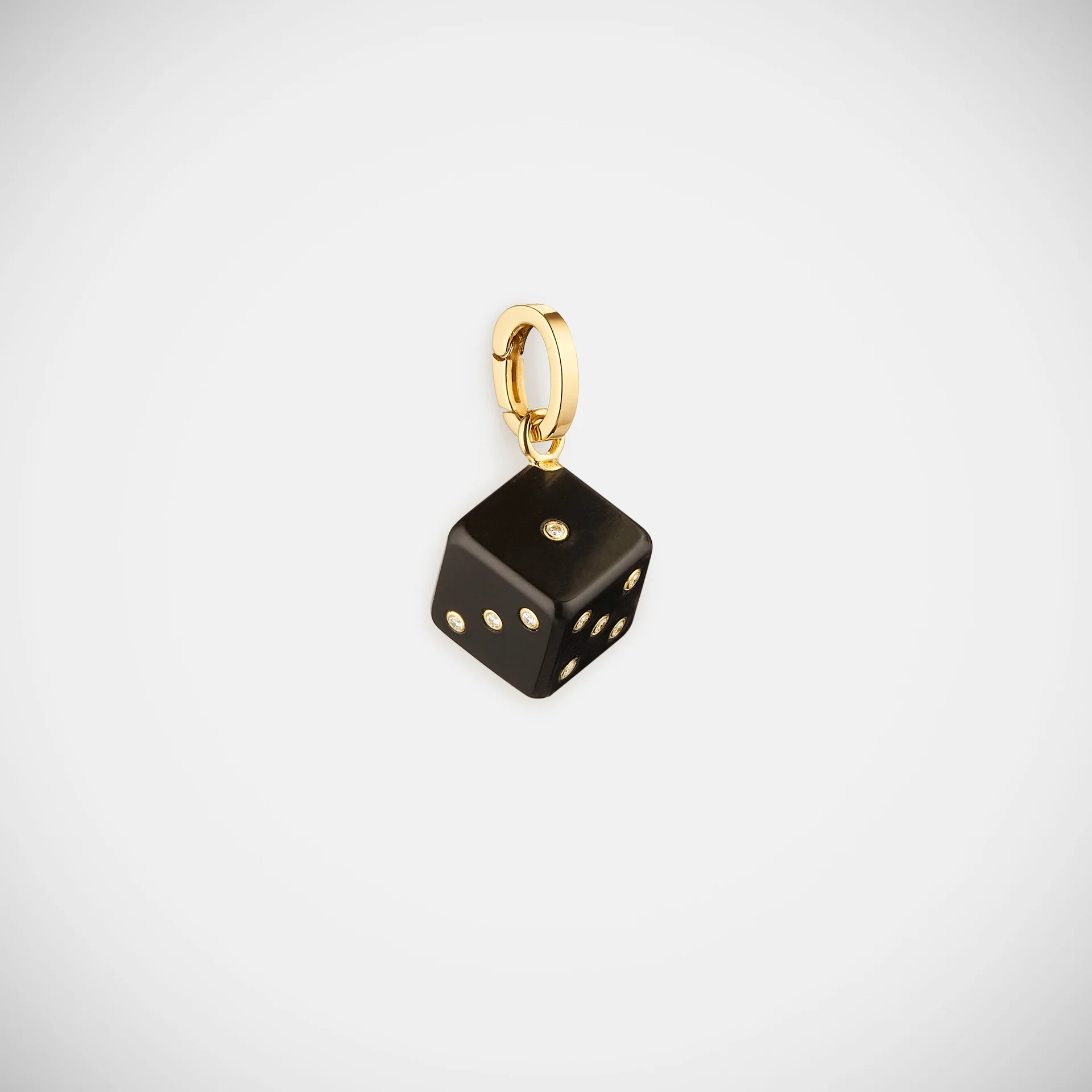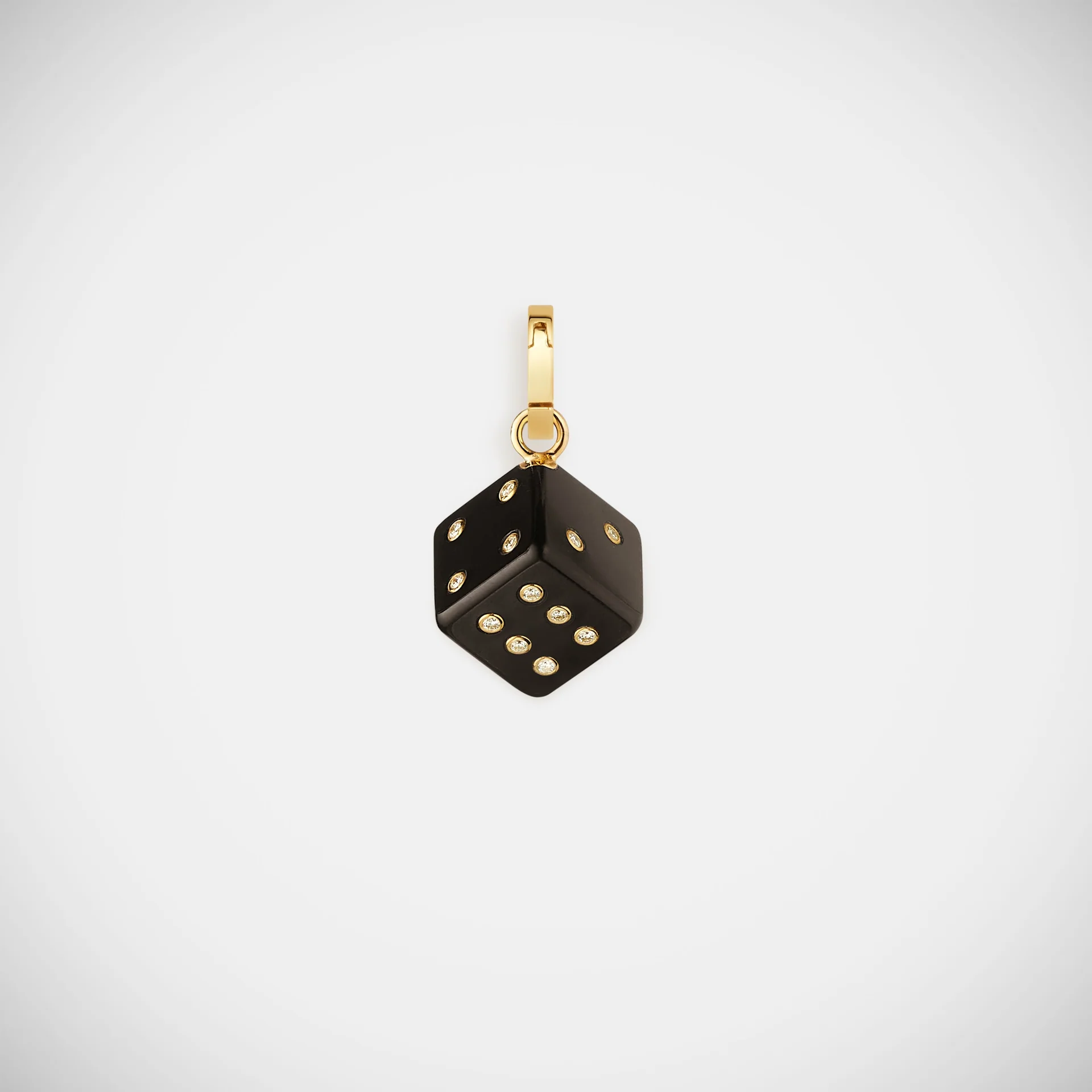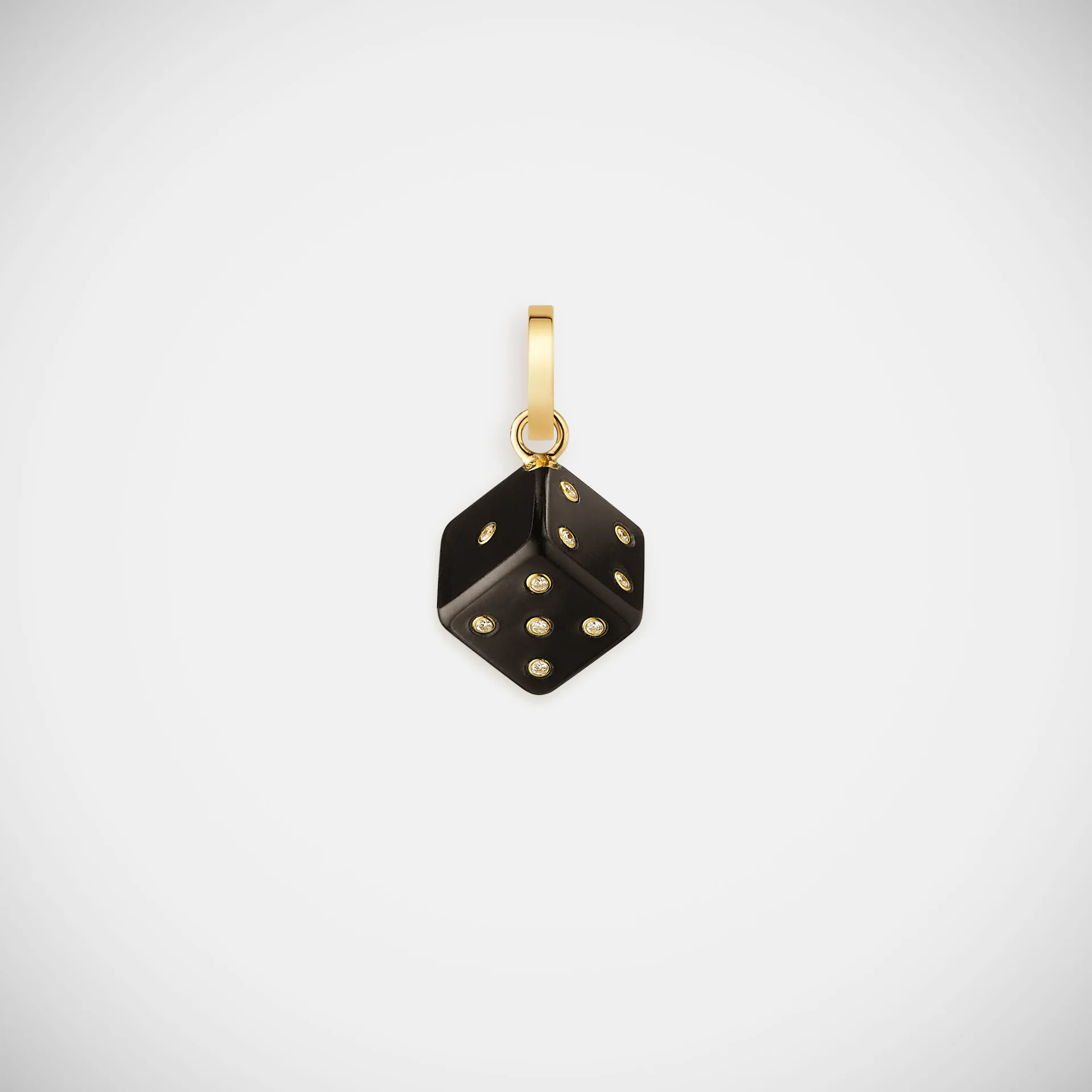 Yellow gold dice pendant in black ebony, set with white diamonds.