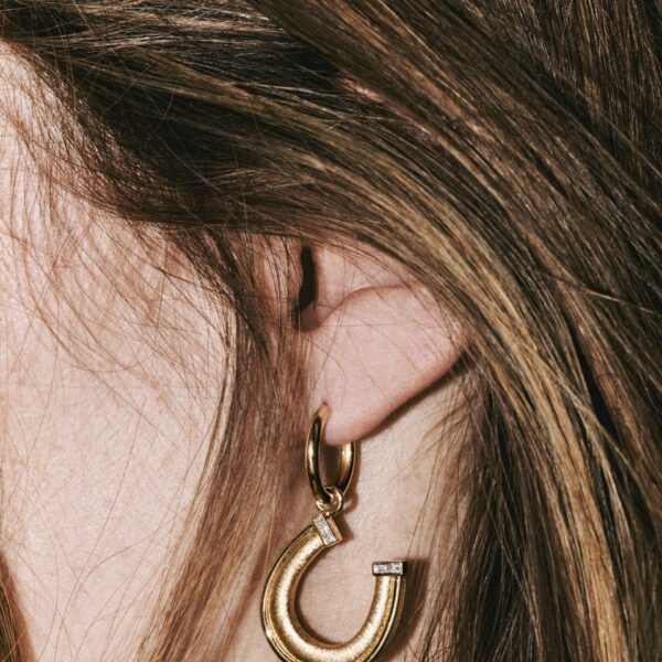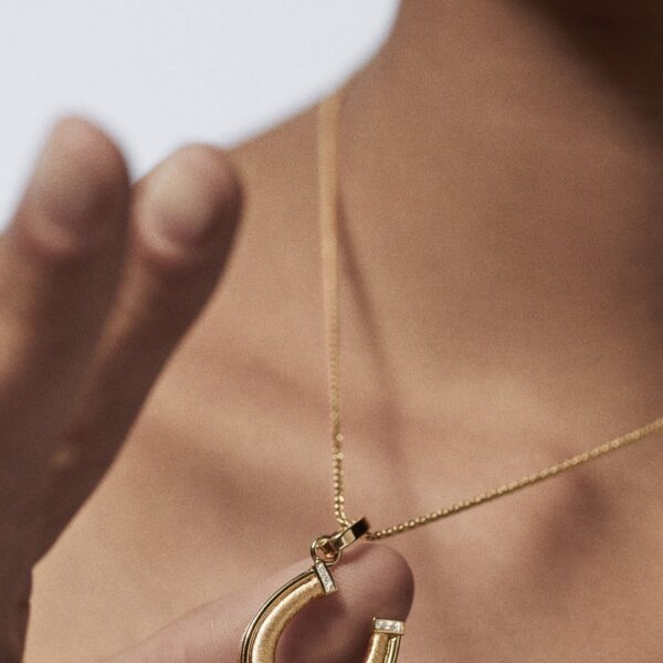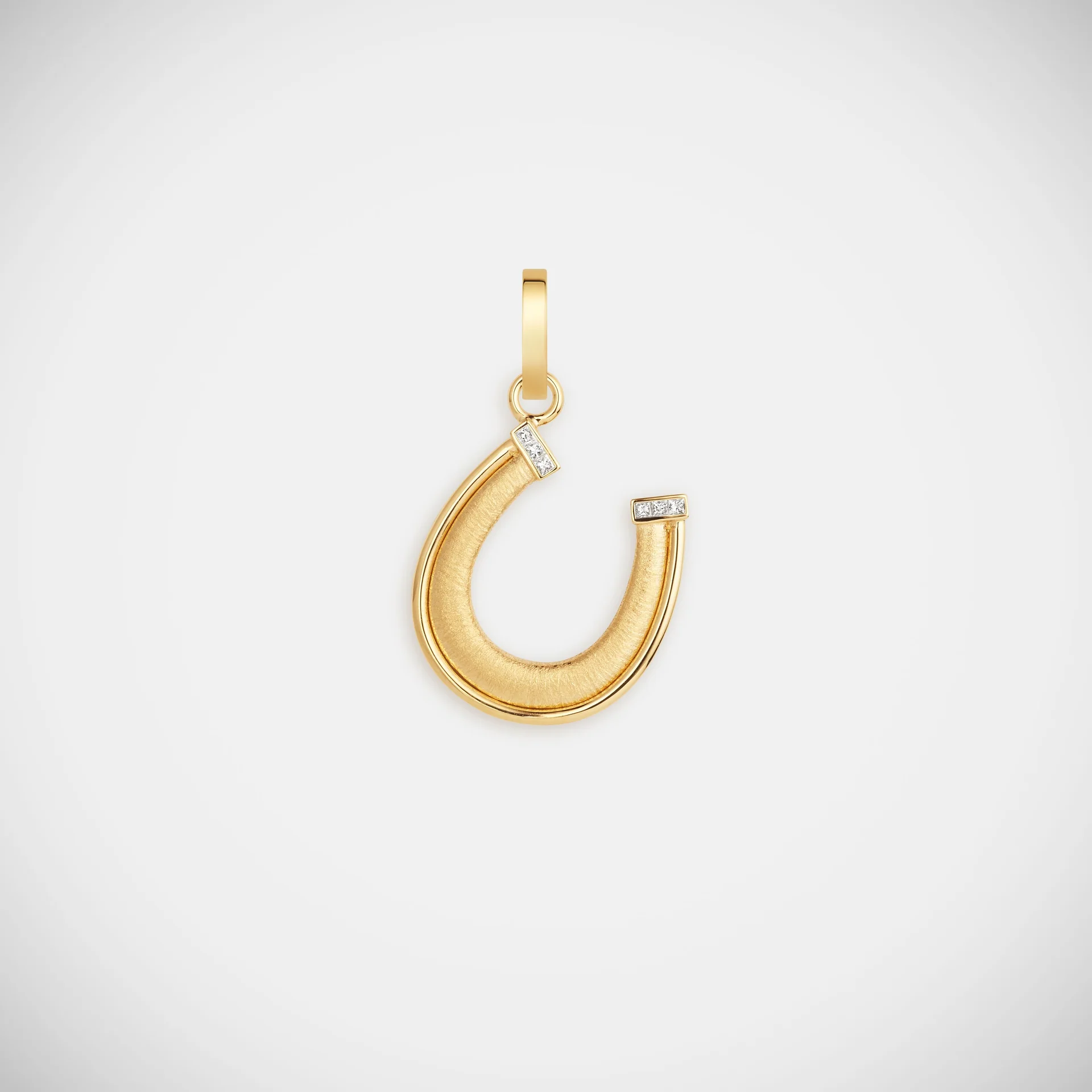 Yellow gold horseshoe shaped pendant with a brushed finish, set with white diamonds.