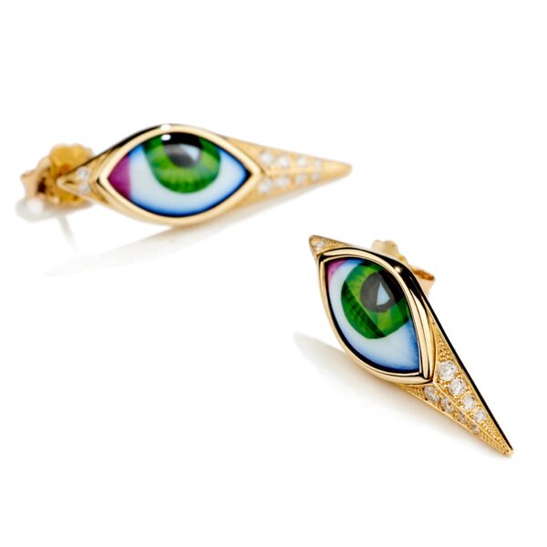14K yellow gold pair of diamond earrings with small green enameled eyes and Diamonds (0.19ct).