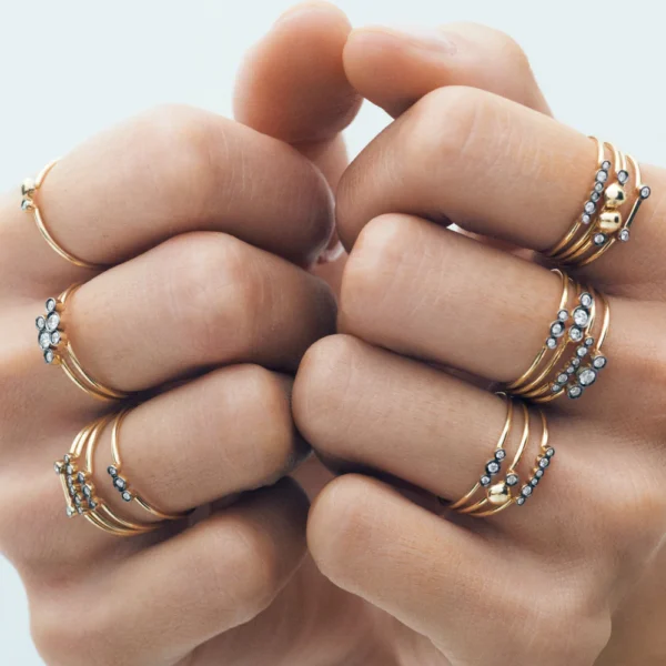 Crafted in 9k yellow and rhodiated gold, the Sigma EL1 ring revisits the signature elements of our Sigma bracelets in a delicate, stackable form. Set with 0.02 ct of white diamonds (G+, VS), it combines graphic precision and subtle radiance. Worn alone, it reveals its quiet strength; stacked, it becomes part of a luminous dialogue.